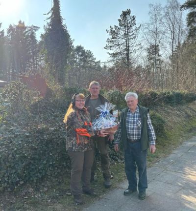 Für 40 Jahre Ehrenamt als Standaufsicht auf dem Schießstand in Heede wird Peter Frisch geehrt. Simone Freyermuth und Hans Wörmcke vom Vorstand der KJS überreichen Peter Frisch als Dankeschön einen Präsentkorb.